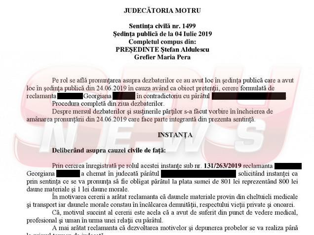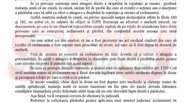 Georgiana, studenta care timp de câteva săptămâni a fost amanta secretă a celui mai influent poliţist din judeţ, a fost anunţată, zilele trecute, că i s-a respins cererea de chemare în judecată depusă împotriva „boss-ului” din Ministerul de Interne. Tânăra solicitase despăgubiri materiale de 800 de lei şi daune morale de un leu, fiindcă ofiţerul ar fi lăsat-o gravidă şi ar fi obligat-o să facă avort pe banii ei. În sprijinul declaraţiei sale, studenta a depus la dosar mai multe documente medicale şi chitanţe eliberate de clinici, din care rezulta că suferise o hemoragie, în urma unui avort. Instanţa a luat act de documentele depuse, însă a apreciat că acestea sunt inutile, atâta timp cât şeful din MAI nu a comis vreo faptă care să-i afecteze reclamantei integritatea corporală, imaginea sau starea psihică. Aşa că judecătorii au decis să respingă cererea în care Georgiana solicita daune morale de un leu.