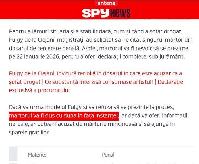 Încă o dată, SPYNEWS.ro a avut dreptate: martorul care a refuzat să se prezinte luna trecută la procesul lui Fulgy de la Clejani va fi dus cu forța în fața magistraților!