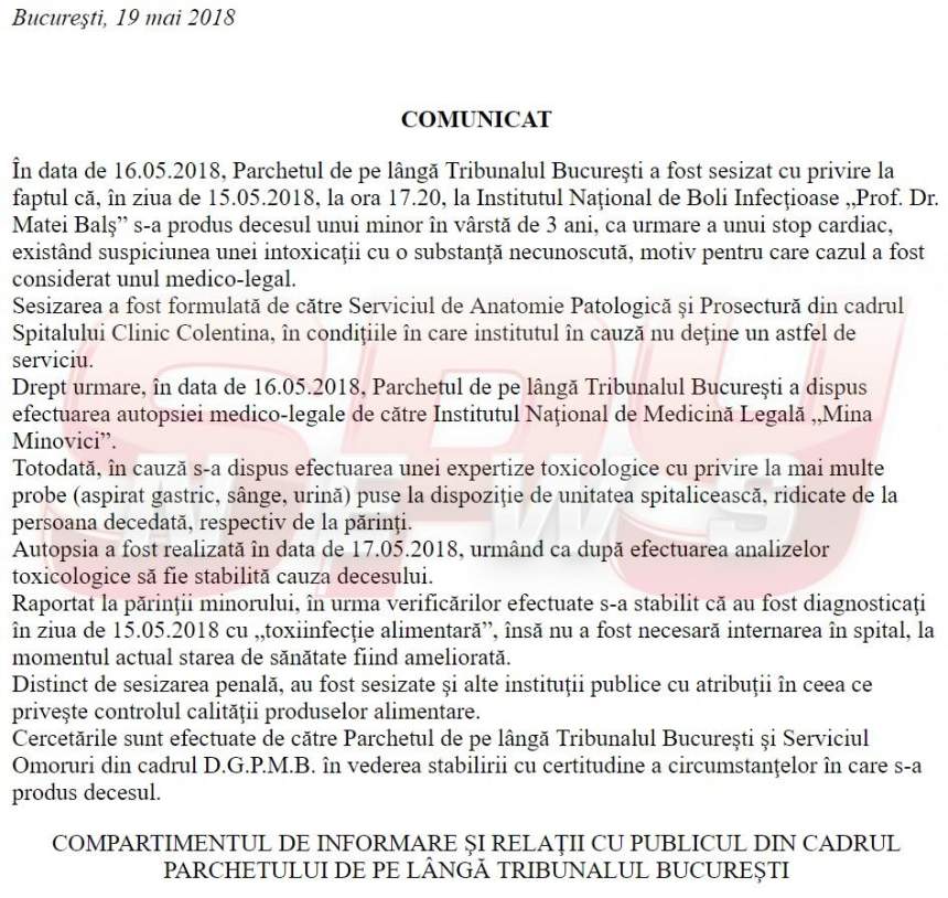 - 19.05.2018 – La cinci zile de la moartea micuţului, după ce SPYNEWS a făcut public acest caz, Parchetul a decis să emită un comunicat. (facsimil jos)