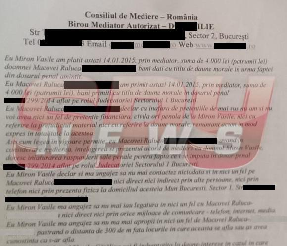 Anul trecut, SPYNEWS a dezvăluit că asasinul care a atacat-o pe Raluca Macovei în propria locuinţă şi-a cumpărat libertatea cu 5.000 de lei. Arestat la momentul respectiv, Vasile Miron şi-a rugat mama să îl salveze, iar femeia a contactat-o, potrivit declaraţiei acesteia, pe Raluca Macovei, pentru a-i cerşi milă. "Am fost la doamna Raluca şi am rugat-o să îl ierte. Mi-a cerut 4.000 de lei. Am făcut împrumut, ca să îi dau ei 4.000 de lei, iar 1.000 de lei am plătit la mediator. După ce i-am dat banii ceruţi, doamna Raluca şi-a retras plângerea, iar fiul meu a fost eliberat. A plecat la rude, în Iaşi, iar la câteva luni avea să fie acuzat de uciderea băieţelului acela de 10 ani. Fiul meu zice că este nevinovat. Acum am mustrări de conştiinţă, nu ar fi trebuit să plătesc pentru eliberarea lui. Nu se mai ajungea aici, dacă rămânea în arest. Acum e condamnat pe viaţă", a declarat mama asasinului, în exclusivitate pentru SPYNEWS.