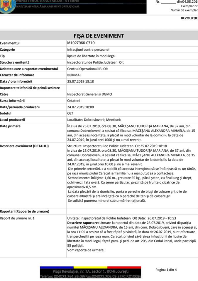 Document oficial! Deşi Alexandra sunase la 112, răpirea era încadrată ca "plecare voluntară". FOTO