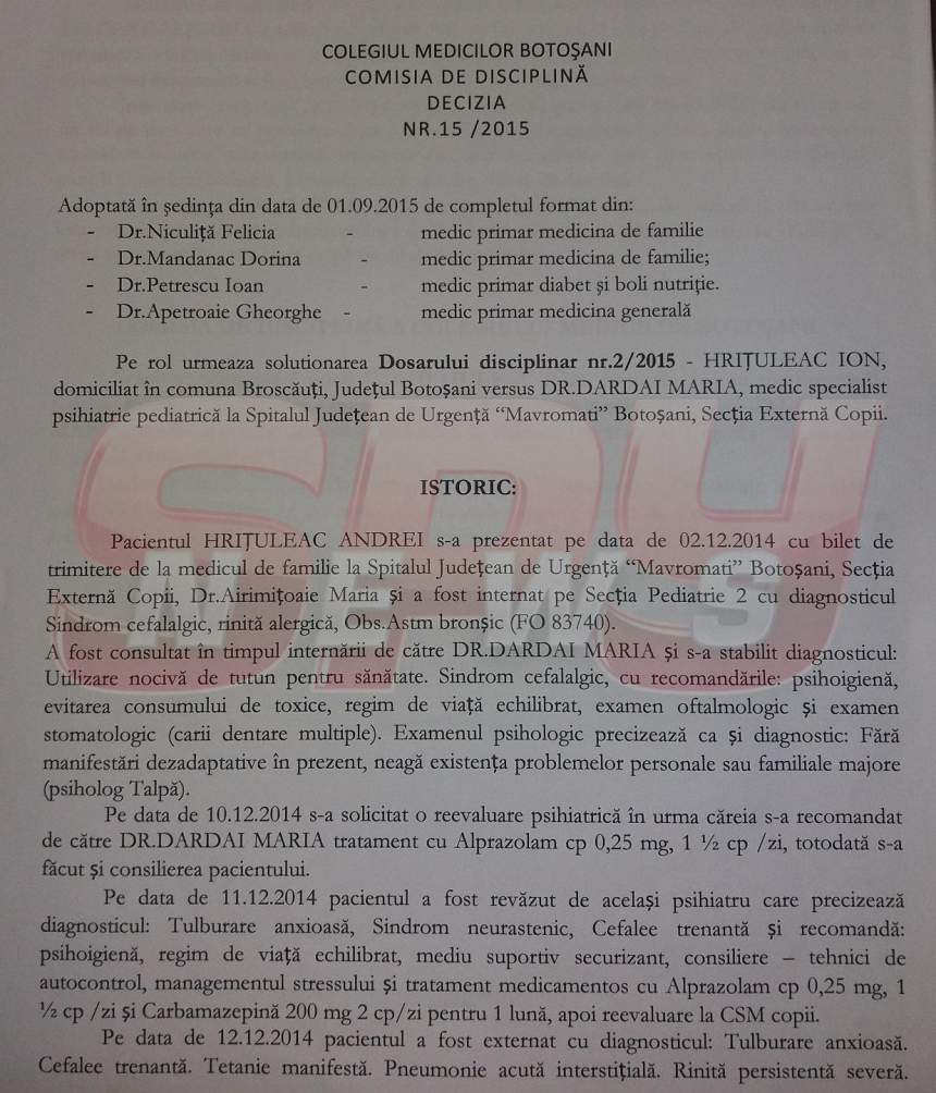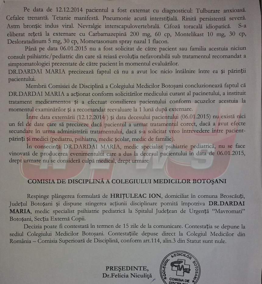 După ce părinţii au sesizat Colegiul Medicilor Botoşani, a avut loc o scurtă anchetă, iar doctorii au fost găsiţi nevinovaţi, aşa că soţii Hriţuleac au contestat decizia, la Bucureşti. Iar de atunci, din 2015, aşteaptă...