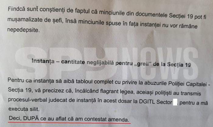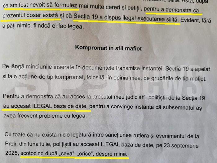 În documentele transmise instanței, bărbatul amendat afirmă că, susținuți de cei de la Control Intern și de conducerea Poliției Capitalei, polițiștii de la Secția 19 au accesat ilegal baza de date, căutând informații sensibile, pentru a-l determina să renunțe la proces.