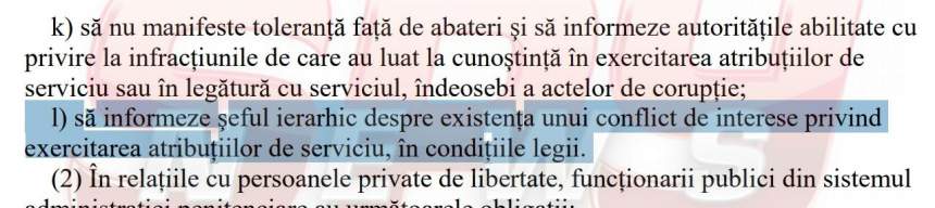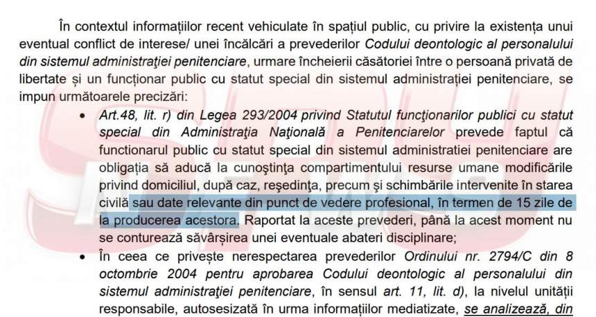 Numai că Veronica nu s-a măritat cu interlopul la prima vedere, nu l-a cunoscut pe acesta pe 18 ianuarie a.c., când a avut loc cununia, ca să aibă la dispoziţie 15 zile din acel moment. Ci ea l-a consiliat la Rahova, imediat după ce a fost încarcerat, apoi a mers, luni la rând, la vizită conjugală, la camera intimă, la Jilava. Iar cum codul deontologic al angajatului ANP prevede că acesta trebuie să anunţe de îndată eventualele conflicte de interese (documente jos), este posibil ca "manevra" celor de la ANP cu termenul de 15 zile să fie doar o încercare disperată, cu iz de abuz în serviciu, de a muşamaliza scandalul.