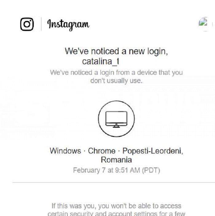 Alerta de conectare și apoi m-am conectat la Instagram, la 7:51 PM din Popești-Leordeni, unde locuiesc acum. Eu nu folosesc deloc contul de Instagram, din acest motiv am primit un e-mail cu ”New login on Instagram”. În acest e-mail (primit la 7:51 PM) scrie ”9:51 AM (PDT)”, adică Pacific Daylight Time, care înseamnă 7:51 PM în România.