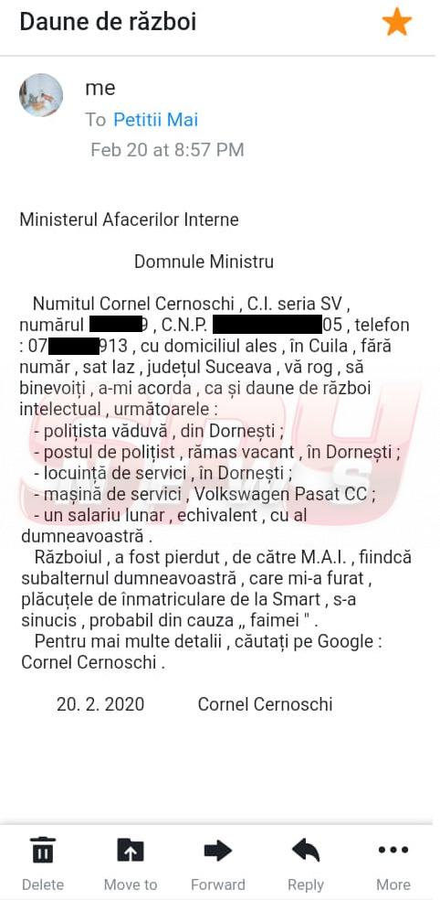 Recent, acelaşi Cornel Cernoschi, care susţine că are o sumedenie de fani, i-a transmis ministrului de Interne un e-mail în care solicita să i se ofere „daune de război intelectual”, după cum urmează: una bucată văduvă de poliţist, una bucată job în MAI, o maşină de serviciu, o locuinţă de serviciu şi, evident, o leafă la fel de mare ca cea a ministrului.
