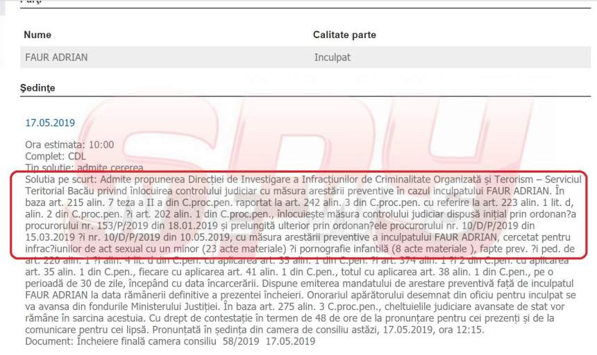 Lăsat liber de DIICOT, Adrian Faur a făcut o nouă victimă: fata din ansamblul folcloric. Abia după ce violatorul în serie a luat cu japca încă o minoră, în timp ce se afla sub control judiciar, ajungând la 24 de victime (!!!), DIICOT a decis să solicite în instanţă arestarea preventivă a infractorului periculos. Iar decizia instanţei demonstrează fără echivoc faptul că cei care l-au lăsat în libertate pe pedofil au fost chiar procurorii DIICOT. (facsimil sus)