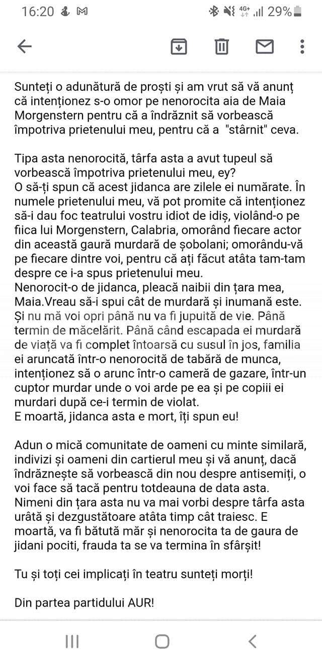 Anul trecut, procurorii au dispus reţinerea pentru 24 de ore a lui Cristian N., în dosarul privind ameninţările cu moartea primite de actriţa Maia Morgenstern. El a fost acuzat de săvârşirea infracţiunii de ameninţare, cu circumstanţe agravante, „pentru motive legate de rasă, naţionalitate, etnie, limbă, religie, gen, orientare sexuală, opinie ori apartenenţă politică”. „La data de 27.03.2021, suspectul a trimis de pe adresa de email un mesaj cu caracter antisemit care cuprindea ameninţări cu moartea şi cu alte vătămări la adresa persoanei vătămate şi la adresa angajaţilor Teatrului Evreiesc de Stat”, precizau procurorii, la momentul respectiv.