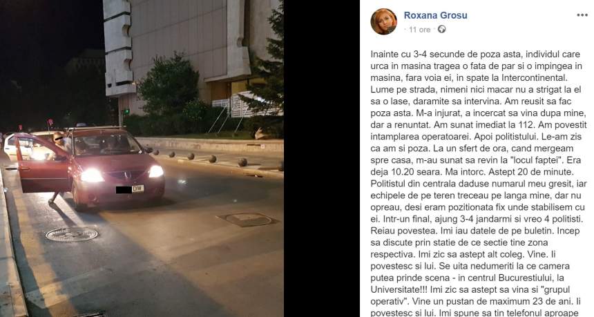 Dosarul penal care o viza pe „femeia răpită” a fost deschis aseară, după ce o tânără a asistat la scena teribilă şi a sunat la 112 pentru a anunţa cele întâmplate. Iată ce a scris pe Facebook, la scurt timp după eveniment, martora: „Inainte cu 3-4 secunde de poza asta, individul care urca in masina tragea o fata de par si o impingea in masina, fara voia ei, in spate la Intercontinental. Lume pe strada, nimeni nici macar nu a strigat la el sa o lase, daramite sa intervina. Am reusit sa fac poza asta. M-a injurat, a incercat sa vina dupa mine, dar a renuntat. Am sunat imediat la 112. Am povestit intamplarea operatoarei. Apoi politistului. Le-am zis ca am si poza. La un sfert de ora, cand mergeam spre casa, m-au sunat sa revin la "locul faptei". Era deja 10.20 seara. Ma intorc. Astept 20 de minute. Politistul din centrala daduse numarul meu gresit, iar echipele de pe teren treceau pe langa mine, dar nu opreau, desi eram pozitionata fix unde stabilisem cu ei. Intr-un final, ajung 3-4 jandarmi si vreo 4 politisti. Reiau povestea. Imi iau datele de pe buletin. Incep sa discute prin statie de ce sectie tine zona respectiva. Imi zic sa astept alt coleg. Vine. Ii povestesc si lui. Se uita nedumeriti la ce camera putea prinde scena - in centrul Bucurestiului, la Universitate!!! Imi zic sa astept sa vina si "grupul operativ". Vine un pustan de maximum 23 de ani. Ii povestesc si lui. Imi spune sa tin telefonul aproape ca maine s-ar putea sa ma sune sa vin sa dau o declaratie. La sectia 1. Sau la 6. Nu se stie inca sigur. Intre timp s-a facut ora 23.20. Chem pe cineva sa ma duca acasa cu masina pentru ca era foarte putin probabil sa mai prind transportul public. O ora si 20 de minute. In Bucuresti, capitala Romaniei”.
