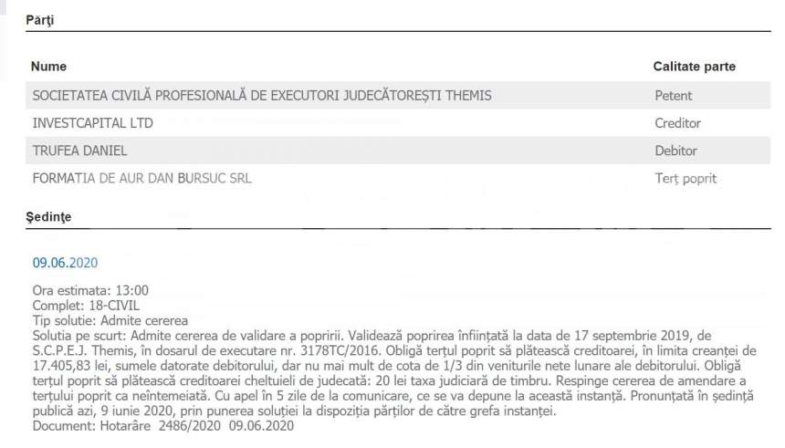 Totul a plecat de la un dosar de executare silită din 2016, deschis pe numele unui angajat al lui Dan Bursuc. Anul trecut, executorii judecătorești au obținut poprirea pe veniturile datornicului, firma lui Bursuc fiind obligată să vireze o treime din veniturile angajatului, până la acoperirea datoriei de 17.405 lei. Însă, cum acest lucru nu s-a întâmplat, executorii au deschis un nou proces, cerând, totodată, amendarea firmei lui Dan Bursuc.