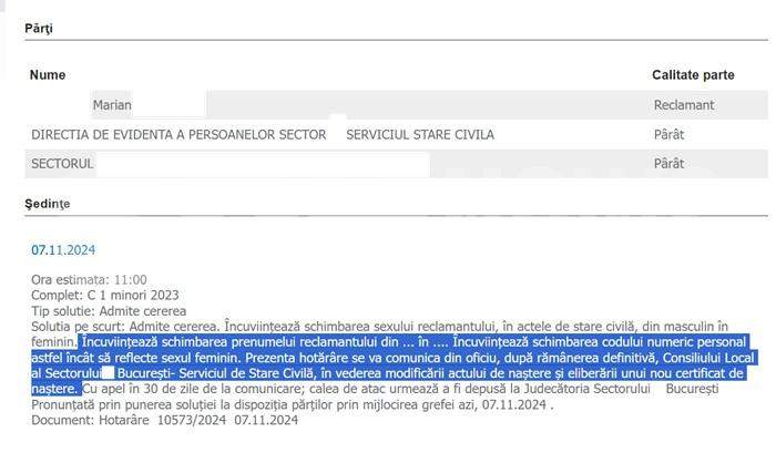 Bucureșteanul Marian a început aventura în justiție în urmă cu doi ani, solicitând ca instanța să îl declare femeie, pentru a i se emite noi documente, cu CNP de doamnă și noul nume, ales de el. „Admite cererea. Încuviinţează schimbarea sexului reclamantului, în actele de stare civilă, din masculin în feminin. Încuviinţează schimbarea prenumelui reclamantului din ... în .... Încuviinţează schimbarea codului numeric personal astfel încât să reflecte sexul feminin. Prezenta hotărâre se va comunica din oficiu, după rămânerea definitivă, Consiliului Local al Sectorului ... Bucureşti - Serviciul de Stare Civilă, în vederea modificării actului de naştere şi eliberării unui nou certificat de naştere”, a decis prima instanță.