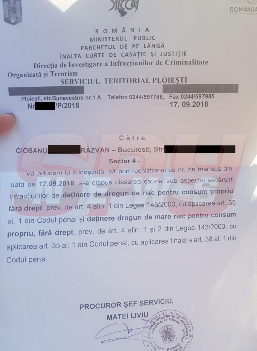 Răzvan Ciobanu a primit, astăzi, documentul care atestă, fără dubii, faptul că a fost anchetat inutil în scandalul drogurilor care i-a făcut praf cariera. În actul oficial semnat de un procuror DIICOT de la Serviciul Teritorial Ploieşti este menţionat faptul că "s-a dispus clasarea cauzei sub aspectul săvârşirii infracţiunii de deţinere de droguri de risc pentru consum propriu, fără drept". Lucru ce demonstrează că designerul a fost declarat nevinovat.
