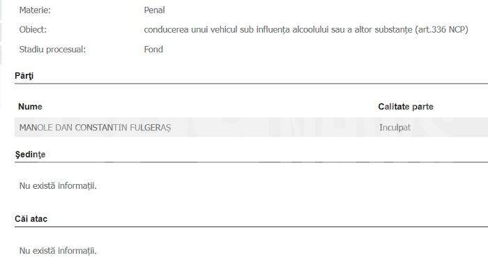 Astăzi, Dan Constantin Fulgeraş Manole, alias Fulgy, a fost citat în fața judecătorilor din București, într-un dosar penal în care are calitatea de inculpat, pentru că, potrivit procurorilor, a condus sub influența alcoolului. Conform unor surse judiciare, Fulgy a fost prins băut la volan de agenții de la Brigada Rutieră pe o stradă din Sectorul 3, în timpul unei acțiuni de amploare, ce viza depistarea conducătorilor auto care circulau sub influența drogurilor sau a băuturilor alcoolice.