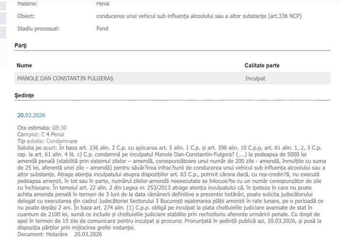 Mezinul Clejanilor, Fulgy, autointitulat „Faraon de Dubai”, pe numele său de inculpat Dan-Constantin-Fulgeraş Manole, a fost condamnat, în urmă cu doar câteva minute, pentru că a șofat sub influența drogurilor.