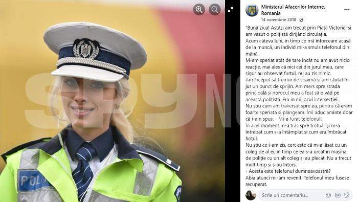 Ministerul Afacerilor Interne, 14 noiembrie 2018: „Bună ziua! Astăzi am trecut prin Piața Victoriei și am văzut o polițistă dirijând circulația. Acum câteva luni, în timp ce mă întorceam acasă de la muncă, un individ mi-a smuls telefonul din mână. M-am speriat atât de tare încât nu am avut nicio reacție, mai ales că nici cei din jurul meu, care sigur au observat furtul, nu au zis nimic. Am început să tremur de spaimă și am căutat în jur un punct de sprijin. Am mers spre strada principală și norocul meu a fost să o văd pe această polițistă. Era în mijlocul intersecției. Nu știu cum am traversat spre ea, pentru că eram foarte speriată și plângeam. Îmi aduc aminte doar că i-am spus: - Mi-a furat telefonul! În acel moment m-a tras spre trotuar și m-a întrebat cum s-a întâmplat și cum era îmbrăcat hoțul. Nu știu ce i-am zis, cert este că m-a lăsat cu un coleg de al ei, în timp ce ea s-a urcat în mașina de poliție cu un alt coleg și au plecat.