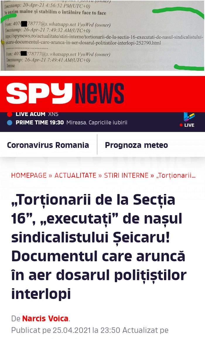 În interceptările procurorilor apar și discuții referitoare la articolele publicate de SPYNEWS, semn că polițiștii torționari monitorizau cu atenție nu doar victimele și martorii, ci și jurnaliștii care făceau dezvăluiri despre infracțiunile lor.