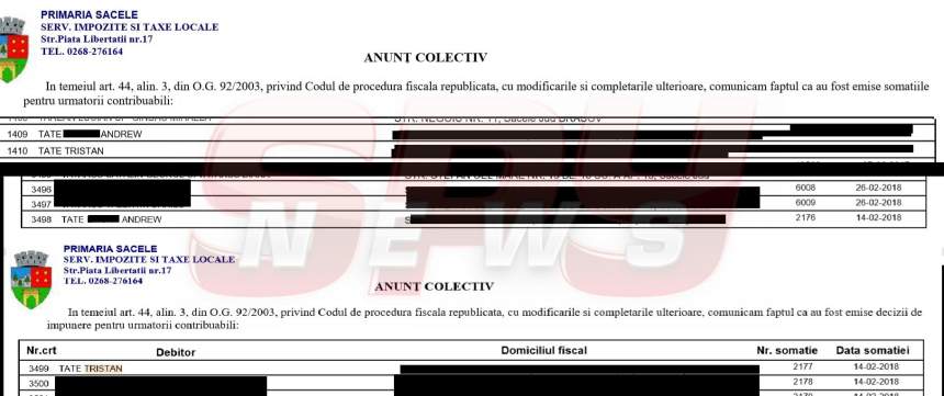 Autorităţile din Săcele, localitate unde Tristan are o firmă, împreună cu fratele său, au emis mai multe somaţii, în ultima perioadă, în încercarea de a-i determina pe afacerişti să plătească dările către stat. De altfel, faptul că afacerea fraţilor Tate nu merge tocmai cum şi-au dorit ei, o demonstrează datele oficiale înregistrate la Fisc, unde aceştia au declarat un profit de doar 900 de lei pe anul 2017.
