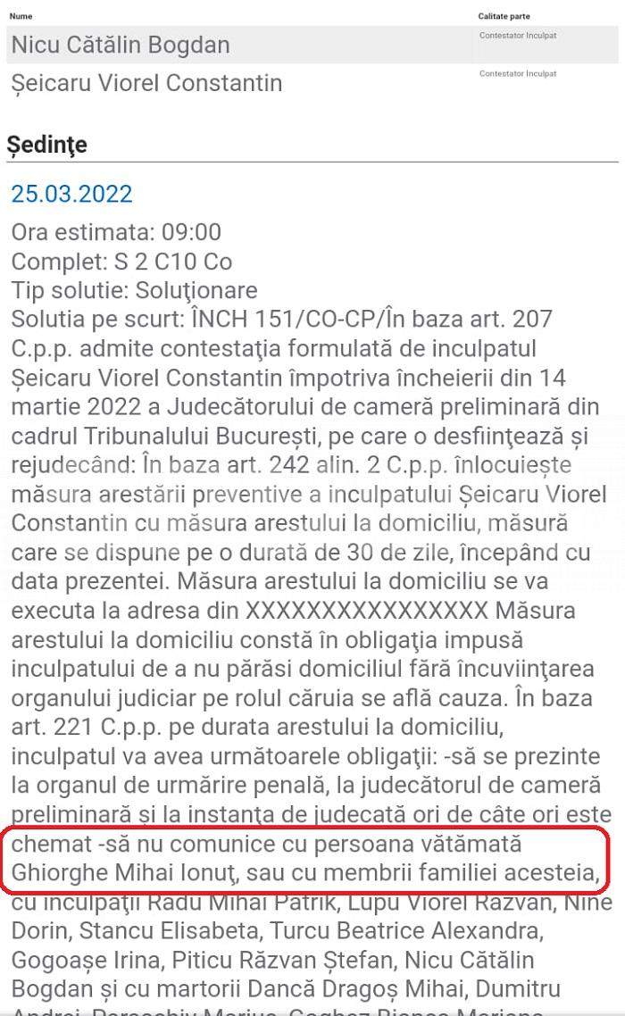 Atrage atenţia inculpatului că în cazul în care va încălca obligaţiile stabilite în sarcina sa sau va comite o nouă infracţiune intenţionată, măsura arestului la domiciliu se va înlocui cu măsura arestării preventive. Dispune punerea de îndată în libertate a inculpatului, dacă nu este reţinut sau arestat în altă cauză. Respinge contestaţia inculpatului Nicu Cătălin Bogdan. În baza art. 275 alin. 2 C.p.p. obligă inculpatului Nicu Cătălin Bogdan la plata sumei de 100 lei, cheltuieli judiciare avansate de stat. Definitivă. Pronunţată prin punerea soluţiei la dispoziţia procurorului şi a inculpaţilor, prin intermediul grefei instanţei, azi, 25 martie 2022”