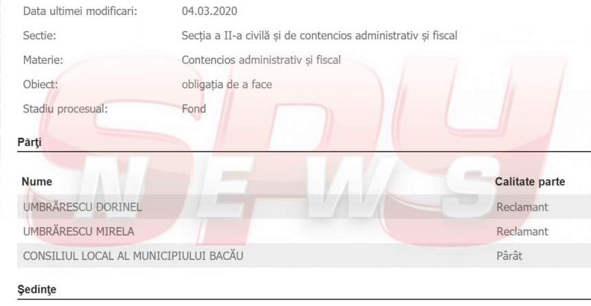 Mirela şi Dorinel Umbrărescu au dat în judecată Consiliul Local al Municipiului Bacău, solicitând anularea unor documente emise de instituţia amintită cu privire la două terenuri deţinute de afacerişti. După un proces care a durat aproape un an, recent, soţii Umbrărescu au primit o veste la care nu se aşteptau: judecătorii le-au respins cererea. “Admite excepţia inadmisibilităţii acţiunii. Respinge ca inadmisibilă actiunea formulată de reclamanţii Umbrărescu Dorinel şi Umbrărescu Mirela în contradictoriu cu pârâtul Consiliul Local al Municipiului Bacău. Cu recurs în 15 zile de la comunicare, cerere ce se va depune la Tribunalul Bacău Secţia a II-a”, au deis magistraţii. Însă, cum milionarul Umbrărescu nu se lasă cu una, cu două, cu siguranţă va ataca hotărârea.