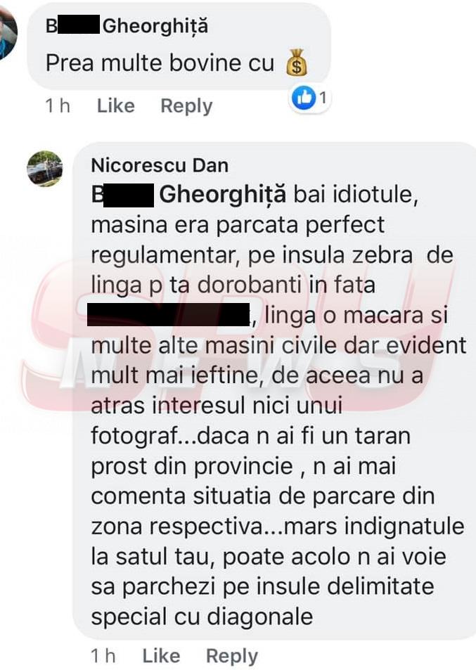 Surprins în repetate rânduri că parchează după bunul plac, afaceristul Dan Nicorescu a călcat din nou pe bec, zilele trecute, când şi-a lăsat bolidul de 300.000 de euro, într-o zonă interzisă. Imaginea cu maşina milionarului a fost postată pe Facebook de jurnalistul Adelin Petrişor, iar comentarile acide au început să curgă. „Prea multe bovine cu bani”, a scris un anume Gheorghiţă B., iar afirmaţia l-a scos din minţi pe Dan Nicorescu. „Bă, idiotule, maşina era parcată perfect regulamentar, pe insula zebră de lângă Piaţa Dorobanţi, lângă o macara şi multe maşini civile, dar, evident, mult mai ieftine, de aceea nu a atras interesul niciunui fotograf. Dacă n-ai fi un ţăran prost din provincie, n-ai ai comenta situaţia de parcare din zona respectivă... Marş, indignatule, la satul tău, poate acolo n-ai voie să parchezi pe insule delimitate special cu diagonale!”, a reacţionat Dan Nicorescu.