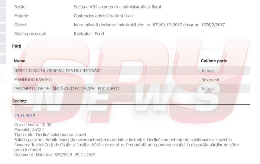 Mahmoud Bascho, jihadistul declarat indezirabil pe teritoriul ţării noastre în anul 2017, a deschis, recent, un proces în care a solicitat revizuirea deciziei de expulzare, ţinta simpatizantului ISIS fiind una clară: să se întoarcă în România, cât mai rapid! Dosarul a fost înregistrat la Curtea de Apel Bucureşti, însă, după ce au analizat cererea jihadistului, magistraţii au ajuns la concluzia că nu este de competenţa lor, aşa că au declinat cauza Curţii Supreme. „Admite excepţia necompeteneţei materiale a instanţei. Declină competenţa de soluţionare a cauzei în favoarea Înaltei Curţi de Casaţie şi Justiţie. Fără cale de atac. Pronunţată prin punerea soluţiei la dispoziţia părţilor de către grefa instanţei”, au decis judecătorii de la Curtea de Apel Bucureşti, la finele anului trecut. Astfel, dosarul de revizuire va fi judecat de ICCJ şi, dacă i se va accepta cererea, sirianul va putea reveni în România înainte de termenul de zece ani.