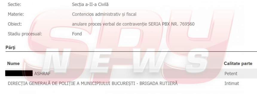 Soţul Oanei Zăvoranu a deschis un proces la Judeătoria Sectorului 1, împotriva Poliţiei Rutiere, solicitând anularea unei sancţiuni contravenţionale. Dacă magistraţii îi vor da câştig de cauză, Ashraf va scăpa şi de amendă, şi de punctele de penalizare. Palestinianul a mai deshis un pros asemănător anul trecut, pentru o altă sancţiune, însă judecătorii i-au respins cererea. Ulterior, Ashraf a contestat hotărârea, însă a pierdut şi apelul, iar cum nu a mai continuat lupta, decizia a rămas definitivă.