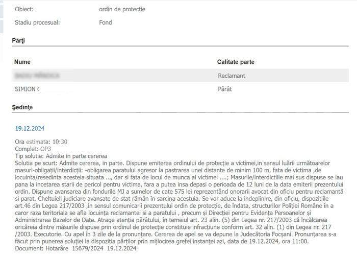 După ce au analizat probele, magistrații au decis să emită un ordin de protecție, în favoarea judecătoarei care a fost amenințată de tatăl lui George Simion. „Admite cererea, in parte. Dispune emiterea ordinului de protecţie a victimei,in sensul luării următoarelor masuri-obligaţii/interdicţii: -obligarea paratului agresor la pastrarea unei distante de minim 100 m, fata de victima ,de locuinta/resedinta acesteia situata ..., dar si fata de locul de munca al victimei ....; Masurile/interdictiile mai sus dispuse se iau pana la incetarea starii de pericol pentru victima, fara a putea insa depasi o perioada de 12 luni de la data emiterii prezentului ordin. (...) Executorie. Cu apel în 3 zile de la pronunţare. Cererea de apel se va depune la Judecătoria Focşani”, este decizia rămasă definitivă, în condițiile în care nu a fost atacată de tatăl lui George Simion.