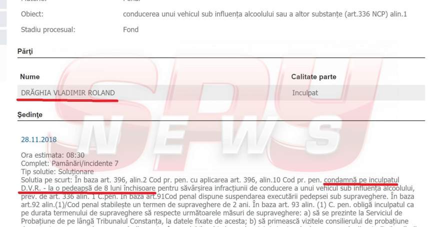 Campionul şi prezentatorul TV Vladimir Drăghia a primit o lovitură sub centură de la judecătorii constănţeni. Deşi spera să fie achitat în dosarul în care era judecat pentru conducerea unui autoturism sub influenţa alcoolului, magistraţii nu s-au arătat prea impresionaţi de CV-ul inculpatului. Astfel, judecătorii au dispus: "Condamnă pe inculpatul Drăghia Vladimir Roland la o pedeapsă de 8 luni închisoare pentru săvârşirea infracţiunii de conducere a unui vehicul sub influenţa alcoolului. Dispune suspendarea executării pedepsei sub supraveghere. Stabileşte un termen de supraveghere de 2 ani".