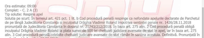 La finele anului trecut, judecătorii constănţeni au dispus: "Condamnă pe inculpatul Drăghia Vladimir Roland la o pedeapsă de 8 luni închisoare pentru săvârşirea infracţiunii de conducere a unui vehicul sub influenţa alcoolului. Dispune suspendarea executării pedepsei sub supraveghere. Stabileşte un termen de supraveghere de 2 ani".
