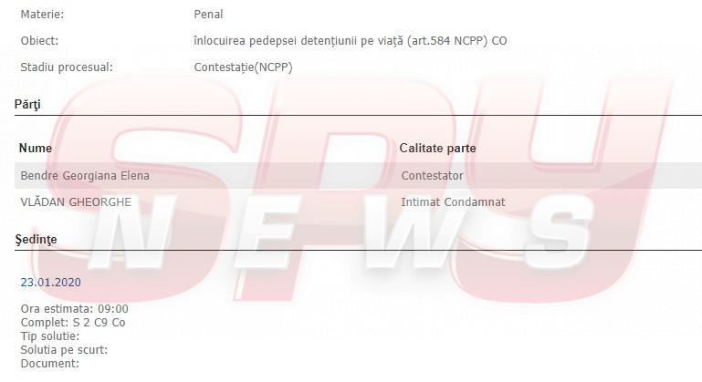 În Ajunul Crăciunului, la Curtea de Apel Bucureşti, a fost înregistrată contestaţia Georgianei Bendre, fiica victimei lui Gheorghe Vlădan. Tânăra nu este de acord cu înlocuirea sentinţei detenţiei pe viaţă cu 25 de ani de închisoare în cazul călăului mamei sale şi a acţionat în acest sens.