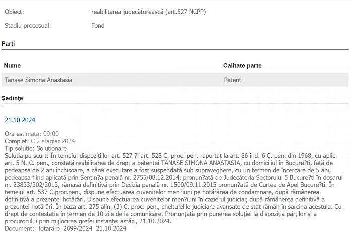 „Constată reabilitarea de drept a petentei TĂNASE SIMONA-ANASTASIA, cu domiciliul în București, faţă de pedeapsa de 2 ani închisoare, a cărei executare a fost suspendată sub supraveghere, cu un termen de încercare de 5 ani, pedeapsa fiind aplicată prin Sentința penală nr. 2755/08.12.2014, pronunțată de Judecătoria Sectorului 5 București în dosarul nr. 23833/302/2013, rămasă definitivă prin Decizia penală nr. 1500/09.11.2015 pronun?ată de Curtea de Apel București. În temeiul art. 537 C.proc.pen., dispune efectuarea cuvenitelor mențiuni pe hotărârea de condamnare, după rămânerea definitivă a prezentei hotărâri. Dispune efectuarea cuvenitelor mențiuni în cazierul judiciar, după rămânerea definitivă a prezentei hotărâri. Cheltuielile judiciare avansate de stat rămân în sarcina acestuia. Cu drept de contestaţie în termen de 10 zile de la comunicare”, a decis instanța.