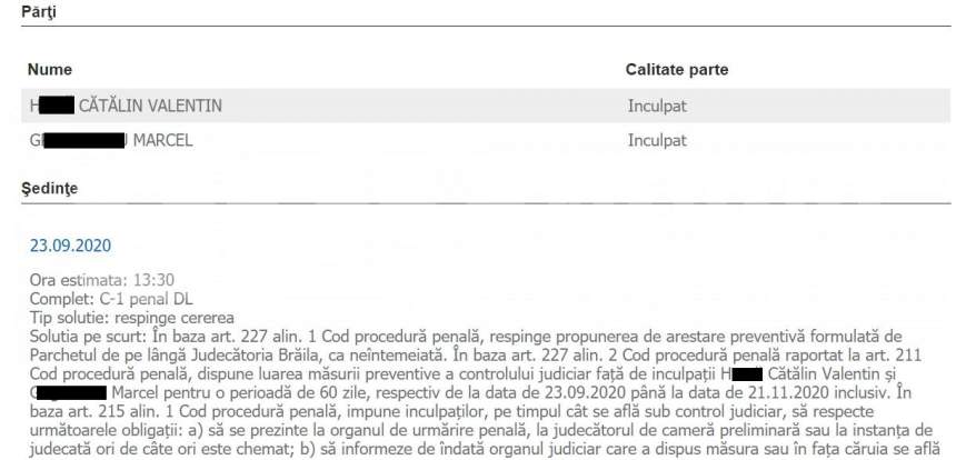Cum victima a fost atacată pe la spate, nu au existat martori, iar despre camere de supraveghere pe câmpul respectiv nici nu putea fi vorba, dosarul părea că nu are nicio șansă de a fi soluționat. După o anchetă ca la carte, polițiștii brăileni au reușit, mai puțin de o lună, să-i identifice pe suspecți. Luați pe sus de judiciariști, autorii au recunoscut faptele și au predat polițiștilor telefonul și ochelarii victimei. Pensia femeii o „spărseseră” între timp. Reținuți de procurori, Cătălin-Valentin H. și Marcel G. au fost prezentați instanței, cu propunere de arestare preventivă, însă judecătorii au considerat că aceștia nu reprezintă un pericol pentru societate, așa că i-au lăsat liberi, sub control judiciar. Procurorii au contestat imediat decizia, iar Tribunalul Brăila va da un verdict pe 29 septembrie.