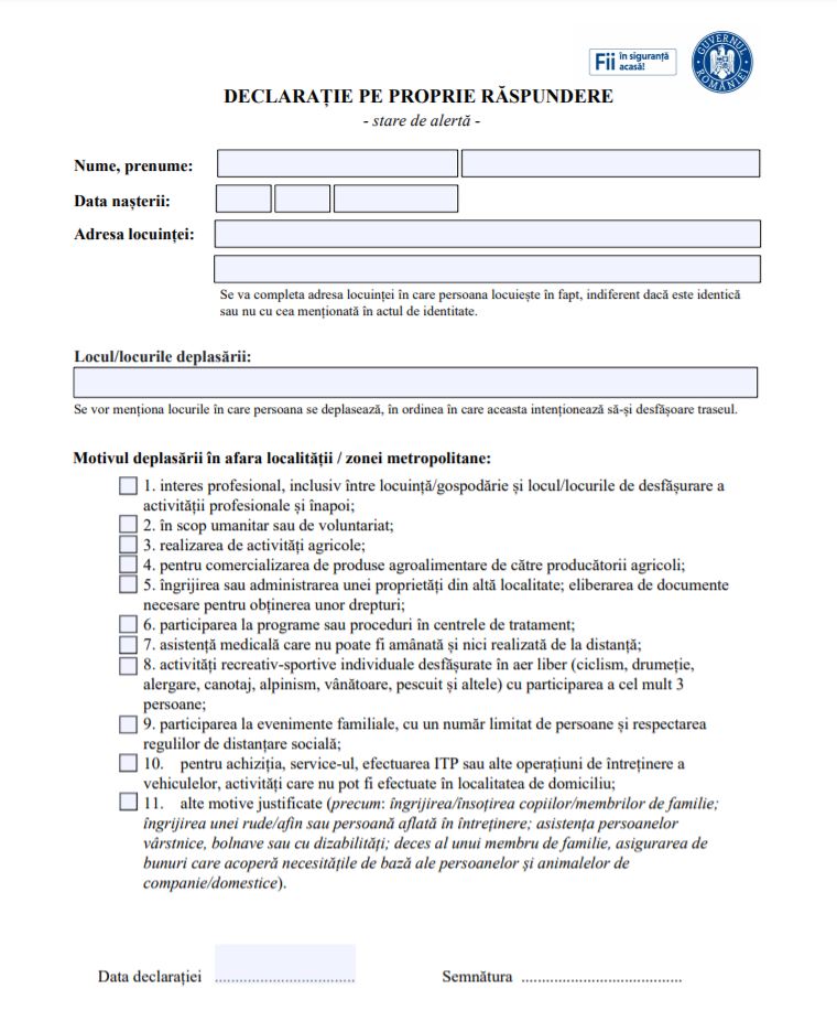 Noua declarație pe proprie răspundere pentru ieșirea din localitate a fost emisă astăzi de către autorități, după ce din prima formă a acesteia lipsea un punct foarte important.