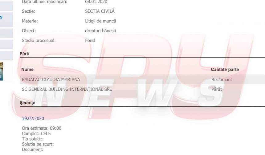 Pe lângă procesele în care se luptă pentru copii şi pentru împărţirea averii, Claudia Pătrăşcanu a deschis, recent, un dosar, împotriva societăţii comerciale pe care o conduce Gabi Bădălău. Conform documentelor depuse la dosar, artista ar fi fost angajată la firma lui Bădălău pe perioada căsniciei, iar în momentul în care a decis să divorţeze i s-ar fi desfăcut contractul de muncă, în mod abuziv, pentru a nu mai avea cu ce să îşi întreţină copiii.