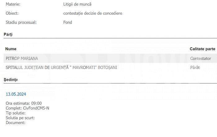 Doctorița Mariana Pitrop, care este susținută de colegii din spitalul în care se dădeau șpăgi pentru angajare (detalii, aici https://www.pna.ro/comunicat.xhtml?id=12500), a contestat în instanță decizia de concediere.