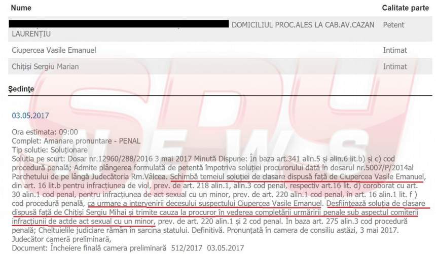 După cum SPYNEWS a dezvăluit ieri (vezi articolul aici), ancheta pare că a fost făcută la mişto încă de la început, poliţiştii omiţând să efectueze cercetări la faţa locului, să ridice unele probe şi să audieze martori indicaţi de copila de 12 ani, întregul dosar părând un "cadou" pentru infractori. Aşa că, în 2017, procurorii au clasat dosarul. Avocatul fetei, Laurenţiu Cazan, angajat abia la finalul anchetei, după ce dosarul fusese "aranjat" de "oamenii legii", a atacat decizia Parchetului de pe lângă Judecătoria Rm. Vâlcea, iar judecătorii care au analizat probele i-au dat câştig de cauză.