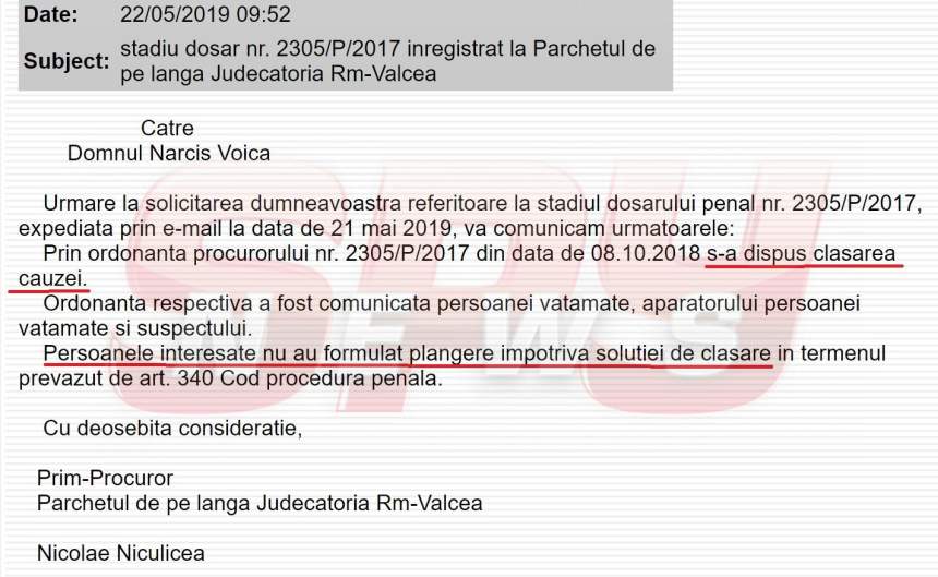 Întrucât nici până astăzi dosarul nu a ajuns în instanţă, reporterii SPYNEWS au solicitat Parchetului Rm. Vâlcea să explice ce s-a întâmplat cu acesta, iar răspunsul transmis de apărătorii legii, plătiţi din bani publici ca să apere interesele victimelor infracţiunilor, a fost de-a dreptul halucinant: dosarul a fost clasat din nou. De această dată, definitiv.