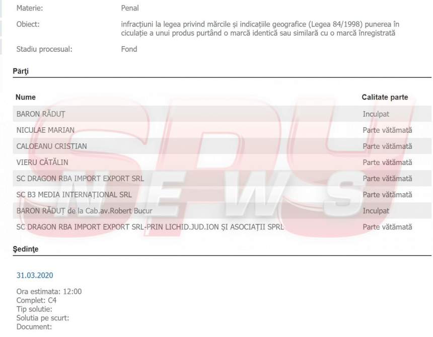 Dacă până acum se războiau prin tribunale pe marca amintită în dosare civile, anul trecut impresarul Radu Baron a căpătat statutul de inculpat în procesul care i-ar putea pecetlui cariera. "Respinge cererile şi excepţiile formulate de inculpatul Baron Răduţ privind obiectul procedurii de cameră preliminară. Constată legalitatea sesizării instanţei cu rechizitoriul emis la 27.07.2018 în dosarul penal nr. 1172/P/2016 al Parchetului de pe lângă Judecătoria Târgu Secuiesc privind pe inculpatul Baron Răduţ, pentru săvârşirea infracţiunii de punere în circulaţie a unui produs purtând o marcă identică sau similară cu o marcă înregistrată pentru produse identice ori similare, faptă prev. si ped. de art. 90 alin. 1 lit. b din Legea 84/1998, a administrării probelor şi a efectuării actelor de urmărire penală. Dispune începerea judecăţii cauzei", au dispus magistraţii, în dosarul care este judecat acum la Tg. Secuiesc.