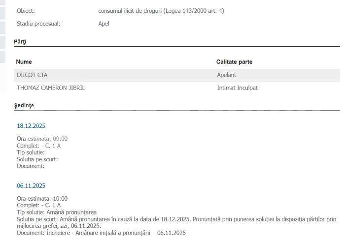 „Condamnare fără acord de recunoaştere. Condamnă pe inculpatul THOMAZ CAMERON JIBRIL, la pedeapsa amenzii penale în cuantum de 3.600 lei pentru săvârşirea infracţiunii de deținere de droguri de risc, fără drept, în vederea consumului propriu, suma reprezentând echivalentul a 120 de zile-amendă, cuantumul sumei corespunzătoare unei zile-amendă fiind de 30 lei. Confiscă de la inculpat cantităţile de 12,31 grame Cannabis şi 5,17 grame Cannabis (contraprobă) depuse la Camera de corpuri delicte din cadrul I.P.J. Obligă inculpatul la plata către stat a sumei de 3.500 lei cu titlu de cheltuieli judiciare”, a decis Tribunalul Constanța.