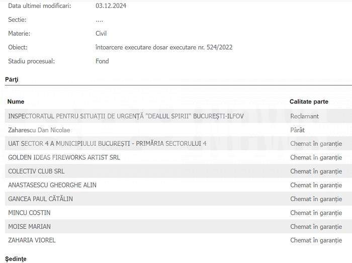 Pentru a scăpa de plata daunelor acordate familiei lui Liviu Zaharescu, unul dintre tinerii uciși de incendiul din Clubul Colectiv, Pompierii din București au deschis recent un proces, împotriva unui membru al familiei îndoliate. În dosarul respectiv sunt chemați și ceilalți vinovați din dosarul Colectiv, ceea ce sugerează că ISU vrea ca daunele să fie achitate și de alții, nu doar de pompierii bucureșteni.