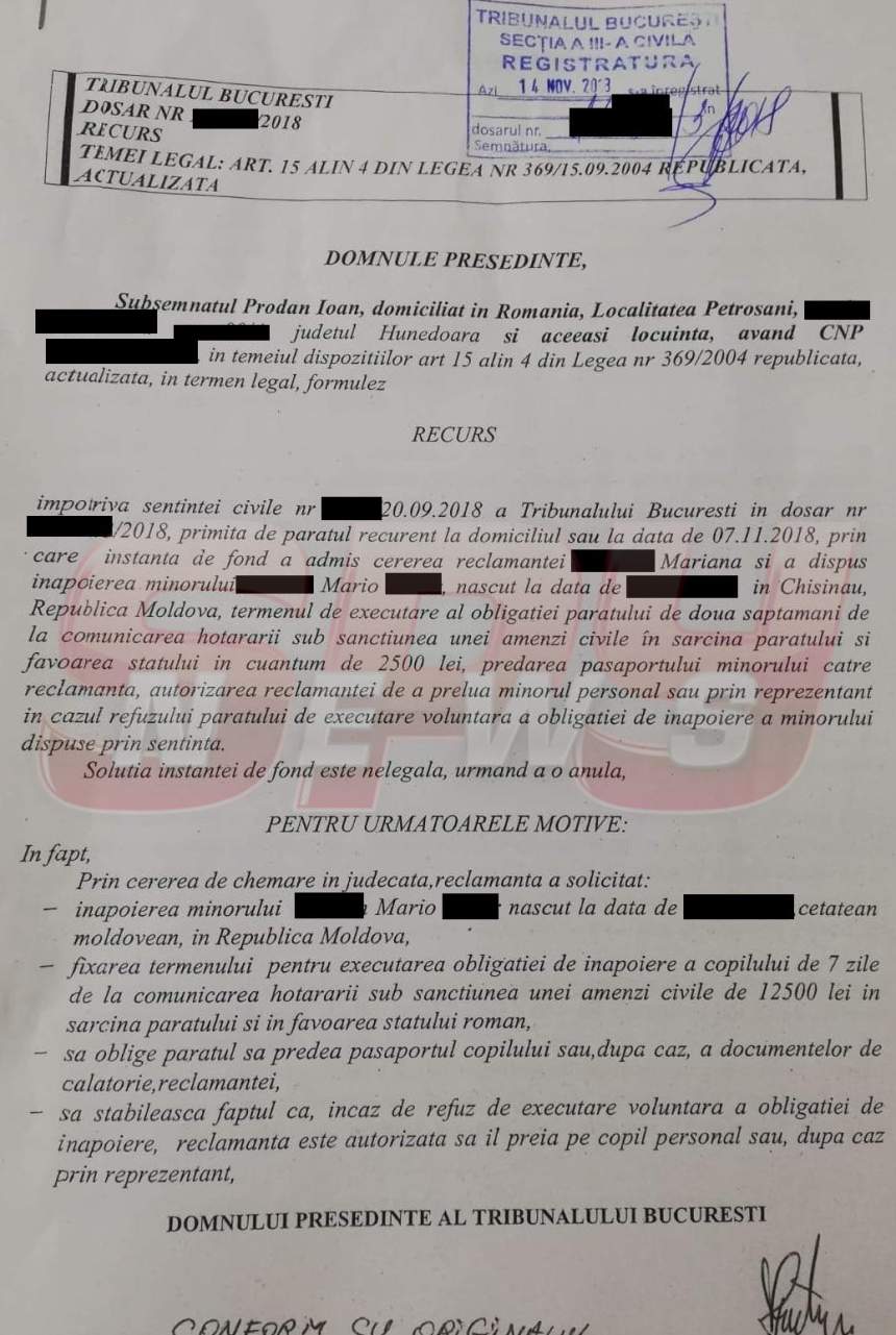 Referitor la documentul de acordare a custodiei invocat de avocatul mamei, apărătorul lui Ioan Prodan a explicat, pentru SPYNEWS: "Hotărârea respectivă a fost atacată cu recurs (foto sus), aşadar mama nu putea să treacă frontiera cu un asemenea document, atâta timp cât nu există o sentinţă definitivă".