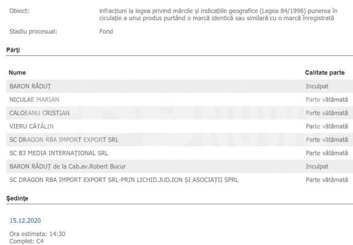 Dosarul penal al lui Radu Baron, lucrat de procurori din 2016 până în 2018, când a fost trimis instanței - care a început judecata în 2020 -, are un nou termen luna viitoare, când, probabil, se va stabili o nouă înfățișare, în 2021. Pe lângă faptul că ar putea să dureze până în 2022 sau 2023, fiindcă este abia la instanța de fond, procesul este plin de surprize. La cel mai recent termen, artiștii care susțin că au fost înșelați de impresarul Baron și au solicitat despăgubiri din partea firmelor acestuia, în alte procese, civile, au aflat că una dintre companii a intrat în faliment, așa că s-ar putea alege cu praful de pe tobă.