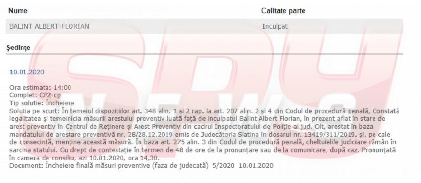 "În temeiul dispoziţiilor art. 348 alin. 1 şi 2 rap. la art. 207 alin. 2 şi 4 din Codul de procedură penală, Constată legalitatea şi temeinicia măsurii arestului preventiv luată faţă de inculpatul Balint Albert Florian, în prezent aflat în stare de arest preventiv în Centrul de Reţinere şi Arest Preventiv din cadrul Inspectoratului de Poliţie al jud. Olt, arestat în baza mandatului de arestare preventivă nr. 28/28.12.2019 emis de Judecătoria Slatina în dosarul nr. 13419/311/2019, şi, pe cale de consecinţă, menţine această măsură", se arată în soluţie.