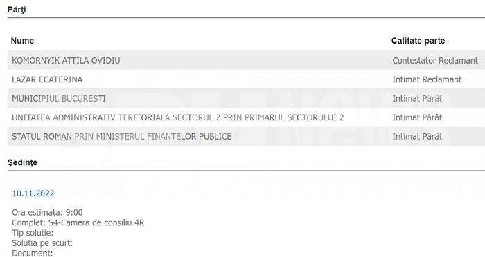 Anterior, Komornyik a mai deschis un proces care viza imobilul amintit, împotriva Oficiului de Cadastru şi Publicitate Imobiliară, însă magistraţii au decis: “Respinge plângerea împotriva încheierii de carte funciară privind pe petentul KOMORNYIK ATTILA-OVIDIU în contradictoriu cu intimaţii Oficiul de Cadastru şi Publicitate Imobiliară Bucureşti şi Biroul de Cadastru şi Publicitate Imobiliară Sector 2, ca inadmisibilă. Cu drept de apel în termen de 30 de zile de la pronunţare pentru părţile prezente şi de la comunicare pentru cele lipsă. Cererea de apel se depune la Judecătoria Sectorului 2 Bucureşti”.