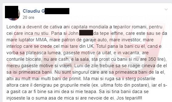 Românul, care în UK este cunoscut drept John, a fost pus la zid de doi dintre prietenii săi, care au dezvăluit că sportivul ar avea mari probleme atunci când vine vorba despre returnat banii datorați. Claudiu G., un român stabilit în Anglia, susține că luptătorul MMA a tras mai multe țepe, de ordinul miilor de lire, și că el încearcă de șase luni să recupereze 350 de lire. ”Până și el dă țepe ieftine, care este sau se dă mare luptător MMA, mare patron de garaje auto, mare investitor, mare interlop care se crede cel mai tare din UK. Totul, până la bani. Când trebuie să dea bani, ba este în vacanță, ba are conturile blocate, ba nu are cash, e la sală... Nu are 350 de lire... Luni de zile trebuie să se roage cineva de el ca să își primească banii. Acum ceva timp mă ruga să șterg postările unora care au de recuperat bani de la el, iar el s-a gândit că ar fi bine să îmi dea și mie țeapă”, susține Claudiu G., care a făcut publice zeci de SMS-uri.