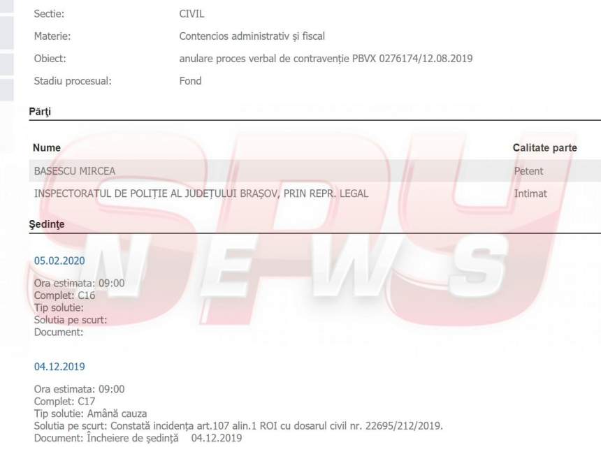 Mircea Băsescu începe anul 2020 cu un nou proces, deschis chiar de el, la Judecătoria Braşov, în care a solicitat anularea unei amenzi pe care a primit-o pe 12 august a.c. Iniţial, Mircea Băsescu a deschis două procese diferite, la aceeaşi judecătorie, însă, după ce au constatat că două instanţe vor judeca acelaşi lucru, magistraţii au decis pe 4 decembrie să conexeze cererile, iar dosarul să fie judecat de prima instanţă sesizată. Astfel, cererea lui Mircea Băsescu va fi analizată pe 5 februarie 2020, când acesta este citat în faţa judecătorilor.