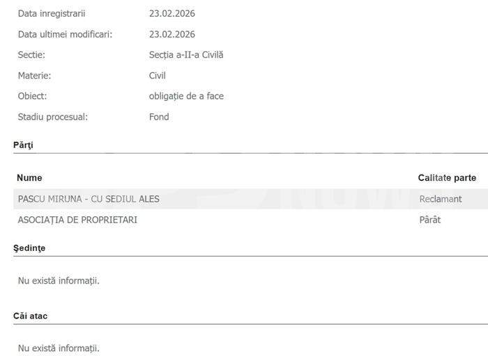 Într-un alt proces, alt treilea, care vizează datoriile la asociația de proprietari, Miruna Pascu a contestat decizia dată de prima instanță. „Admite în parte cererea formulată de reclamanta ASOCIATIA DE PROPRIETARI ... în contradictoriu cu pârâta Pascu Miruna. Obligă pârâta la plata către reclamantă a următoarelor sume: 537,93 lei reprezentând contravaloarea cotelor de întreţinere pentru luna februarie 2024 – ap. nr. 23 şi 2100,02 lei reprezentând fond reparaţii faţadă aferent perioadei decembrie 2023 (parţial) – februarie 2024 – ap. nr. 23 precum şi la plata sumei de 1.780,72 lei reprezentând contravaloarea cotelor de întreţinere pentru lunile decembrie 2023 – februarie 2024 – ap. nr. 24 şi 4.073,17 lei reprezentând fond reparaţii faţadă aferent perioadei noiembrie 2023 (parţial) – februarie 2024 - ap. nr. 24. Obligă pârâta la plata către reclamantă a sumei de 1.200 lei cu titlu de cheltuieli de judecată, reprezentând onorariu avocaţial”, este decizia atacată de mama ucigașului Vlad Pascu.