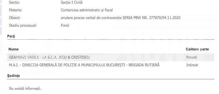 În încercarea de a-și salva permisul de conducere și de a scăpa de o amendă primită de la agenții de circulație din București în urmă cu două luni, Vasile Geambazi a deschis un proces împotriva Poliției. Momentan, judecătorii nu au stabilit data la care va avea loc primul termen, însă probabil Geambazi va afla luna viitoare dacă rămâne cu amenda sau aceasta va fi anulată de instanță.