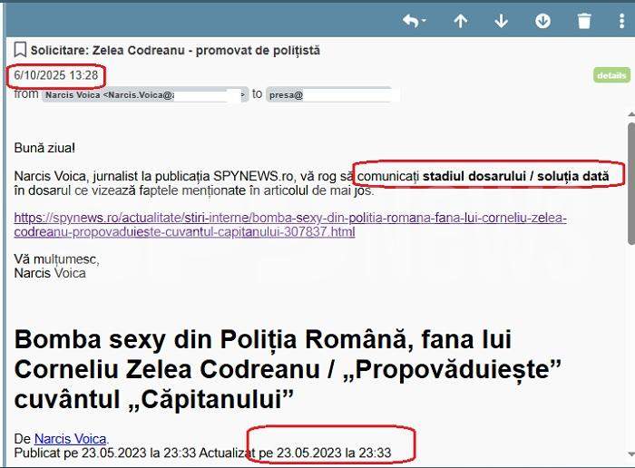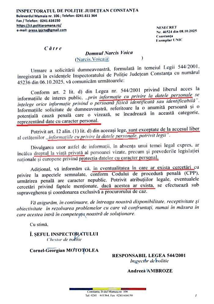 În mod bizar, chestorul Cornel Georgian Mototolea, șeful IPJ Constanța, afirmă în document, în mod total neadevărat, că reporterii SPYNEWS.ro ar fi cerut date cu caracter personal ale polițistei, cu toate că solicitarea viza strict măsurile luate cu privire la postarea agentei, și nu adresa ei de-acasă, numele sau CNP-ul ori alte elemente ce ar fi putut conduce la identificarea acesteia.