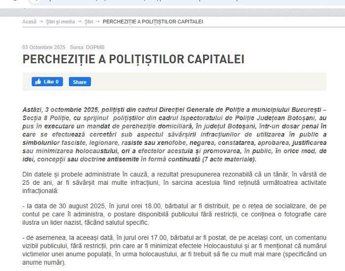 „La data de 3 octombrie 2025, polițiști din cadrul Direcției Generale de Poliție a municipiului București – Secția 8 Poliție, cu sprijinul polițiștilor din cadrul Ispectoratului de Poliție Județean Botoșani, au pus în executare un mandat de percheziție domiciliară, în județul Botoșani, într-un dosar penal în care se efectuează cercetări sub aspectul săvârșirii infracțiunilor de utilizarea în public a simbolurilor fasciste, legionare, rasiste sau xenofobe, negarea, constatarea, aprobarea, justificarea sau minimizarea holocaustului, ori a efectelor acestuia și promovarea, în public, în orice mod, de idei, concepții sau doctrine antisemite în formă continuată (7 acte materiale)”, preciza Poliția Română, în cazul bărbatului încătușat săptămâna trecută.